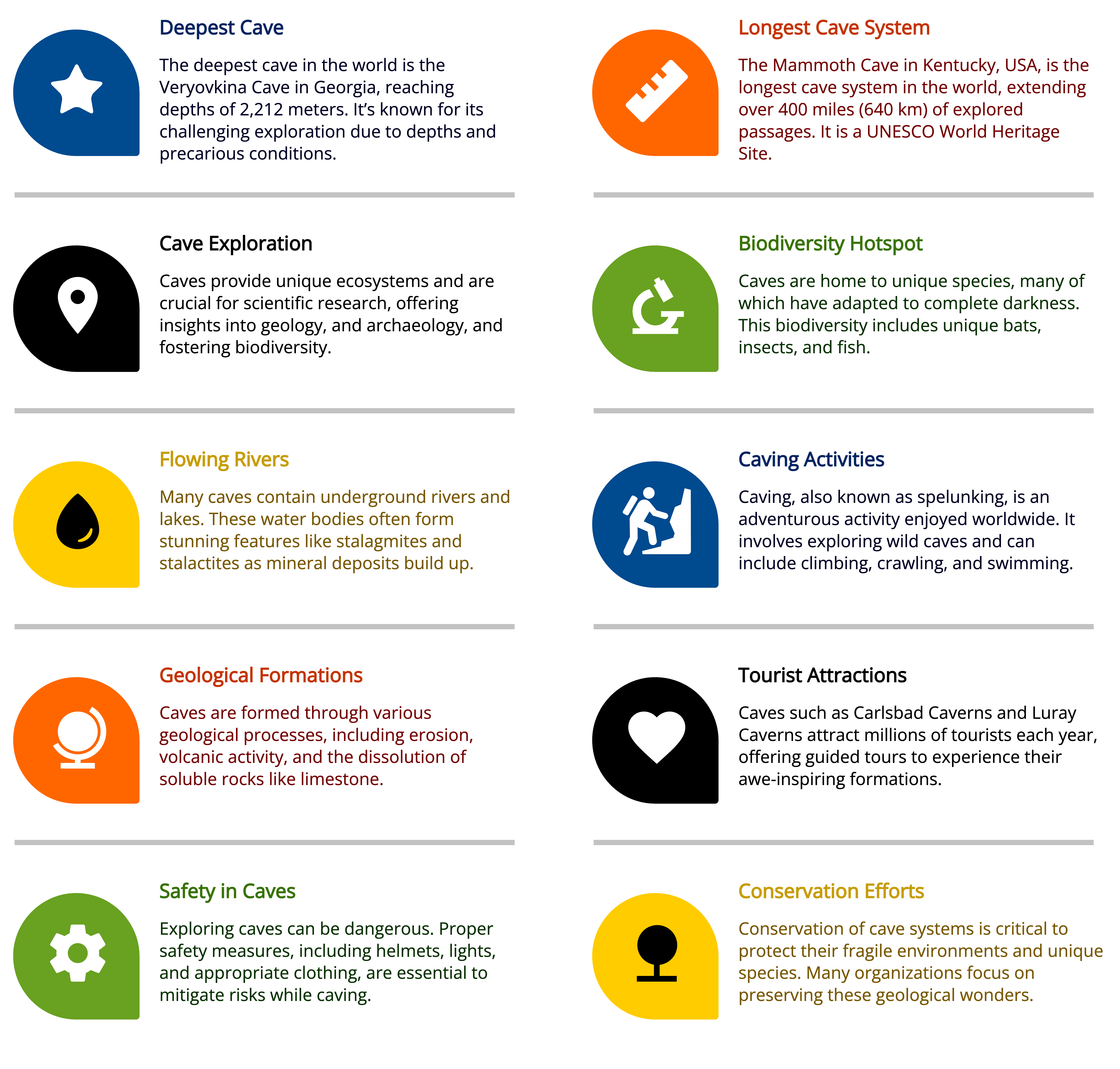 - Some caves, such as Waitomo Caves in New Zealand, are illuminated by glowworms, creating a magical starry effect.